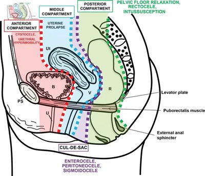 - Enterocele, where the peritoneum or small bowel prolapses into the vaginal wall
