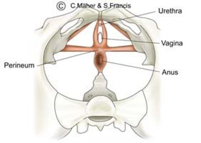 The relationship of the pelvic floor and the organs exiting the pelvis is shown to the left. In the following series of diagrams I hope to build up the complete pelvic floor so that you can understand the anatomical relationship of the muscles, fascia, ligaments and organs of the female pelvic floor.