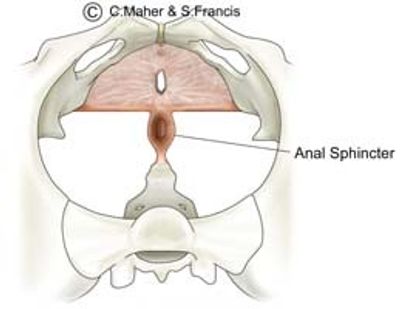 Exiting the female pelvis from the front to the back, is the urethra, vagina and anus. The anus is surrounded by the anal sphincter which is connected to the sacrum behind and the perineum muscles in front. An intact and functioning anal sphincter is important in maintaining faecal continence.
