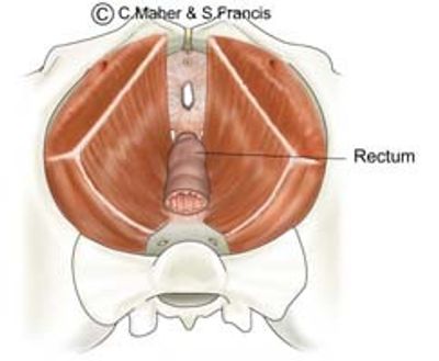 The rectum lies on the pelvic floor and joins to the anus as it passes through the pelvic floor. When the pelvic floor muscles are contracted the anorectal junction is pulled forward. At defecation the muscle relaxes and allows faeces to enter the anus for emptying.